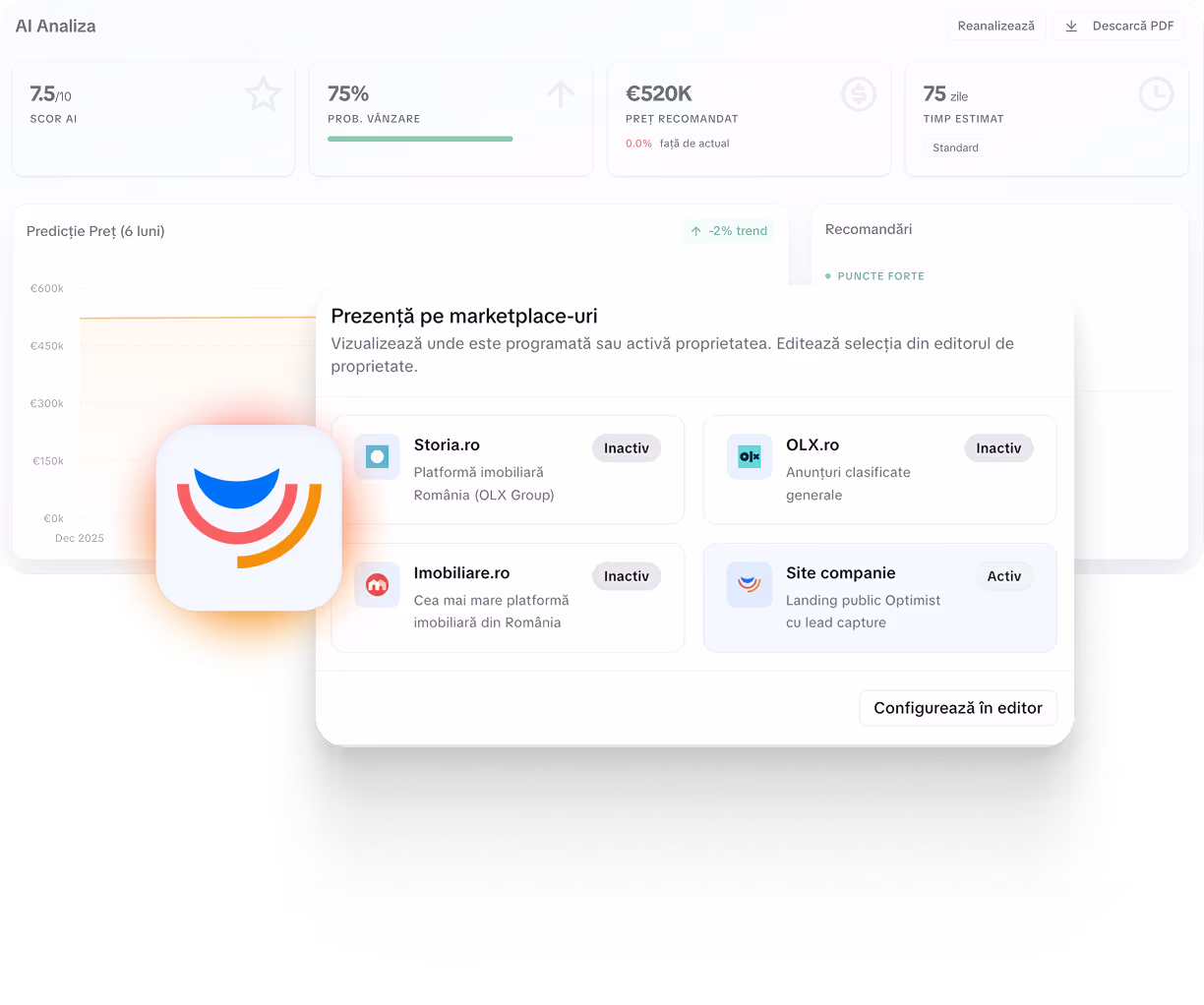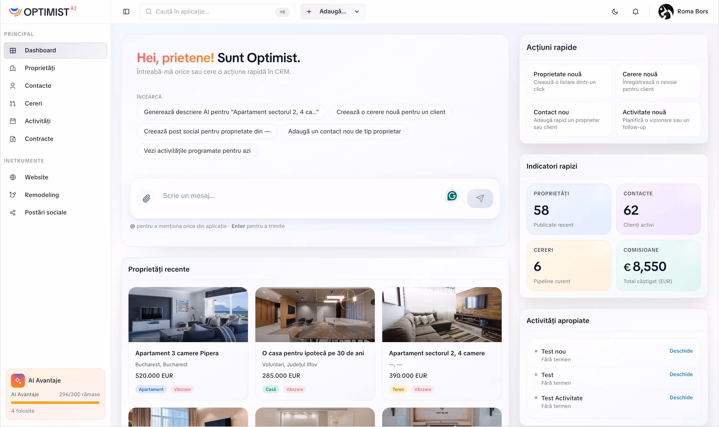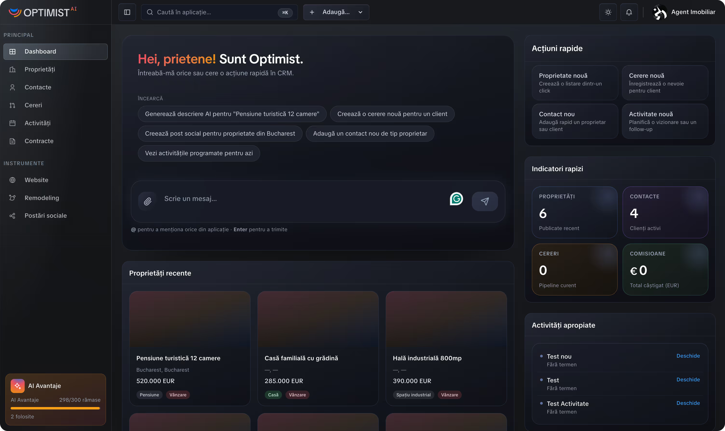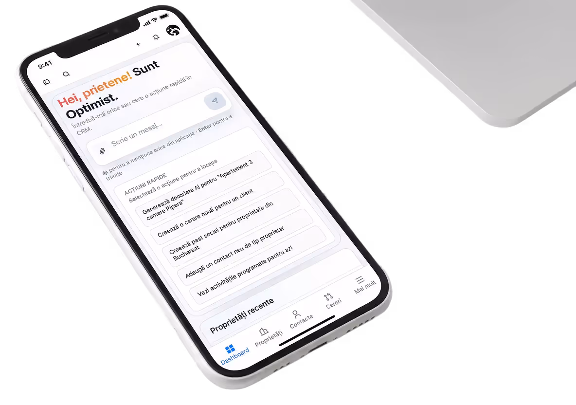Spui ce vrei, iar Optimist construiește automat un website complet: pagini, proprietăți, imagini reale, formulare și hosting inclus.