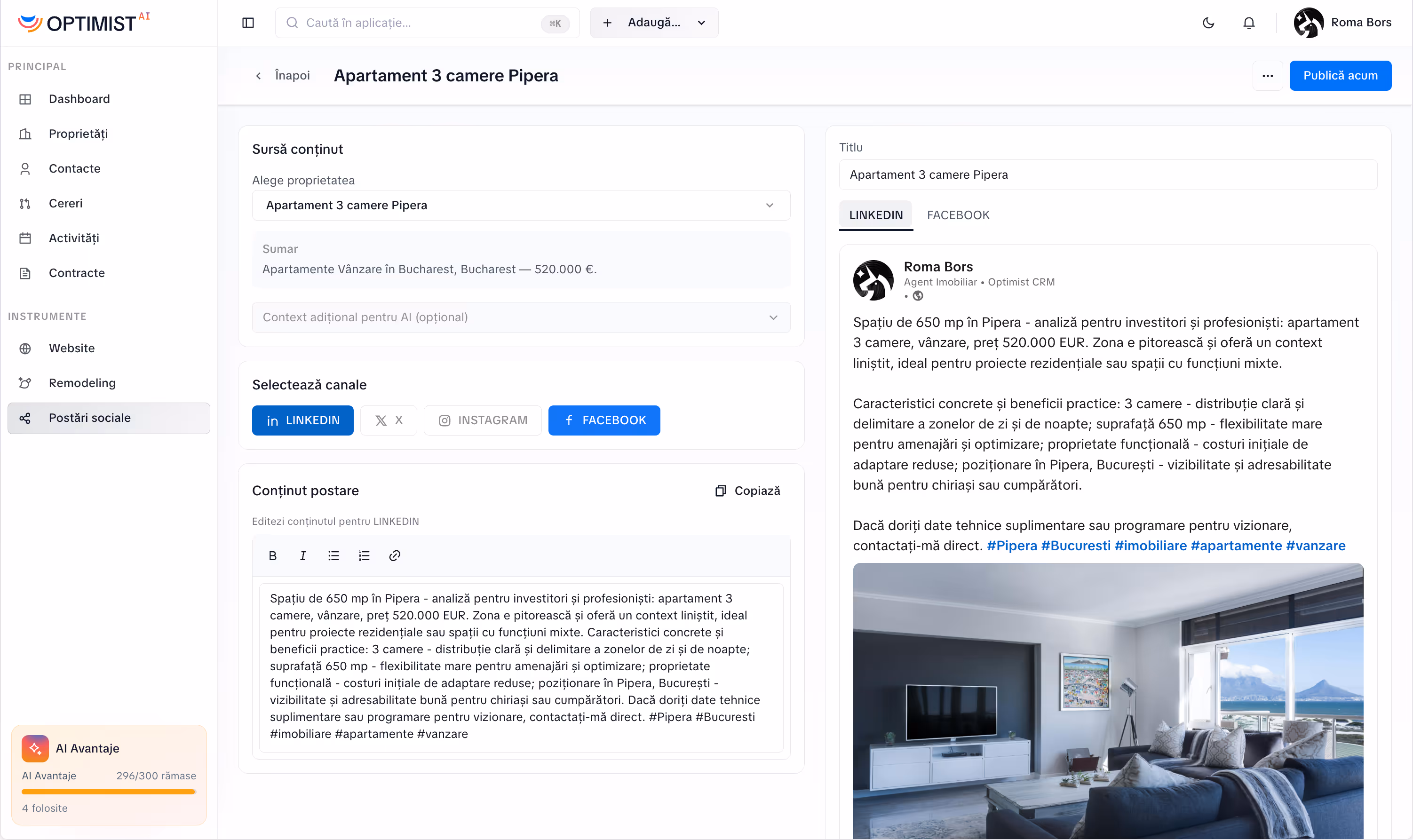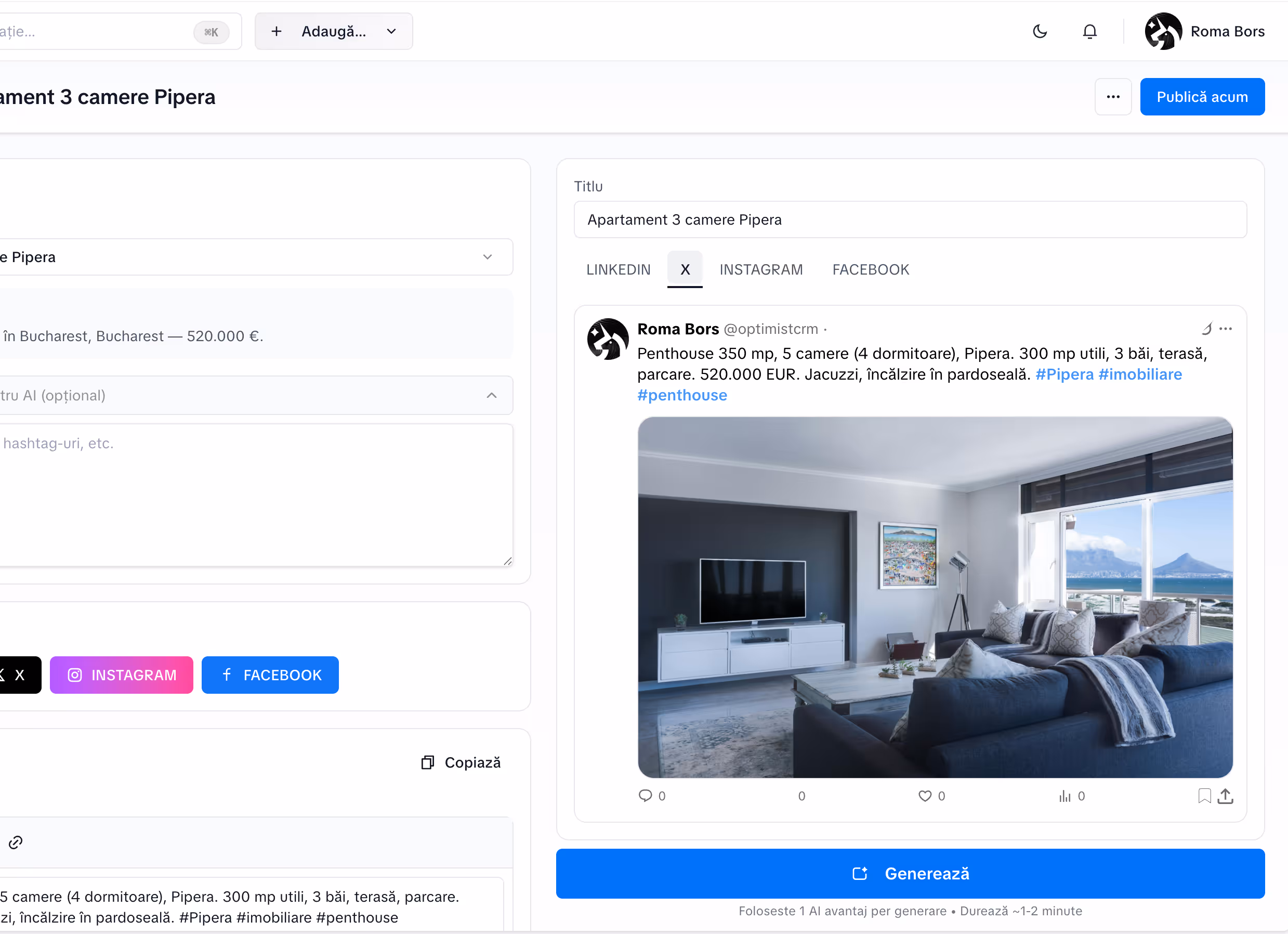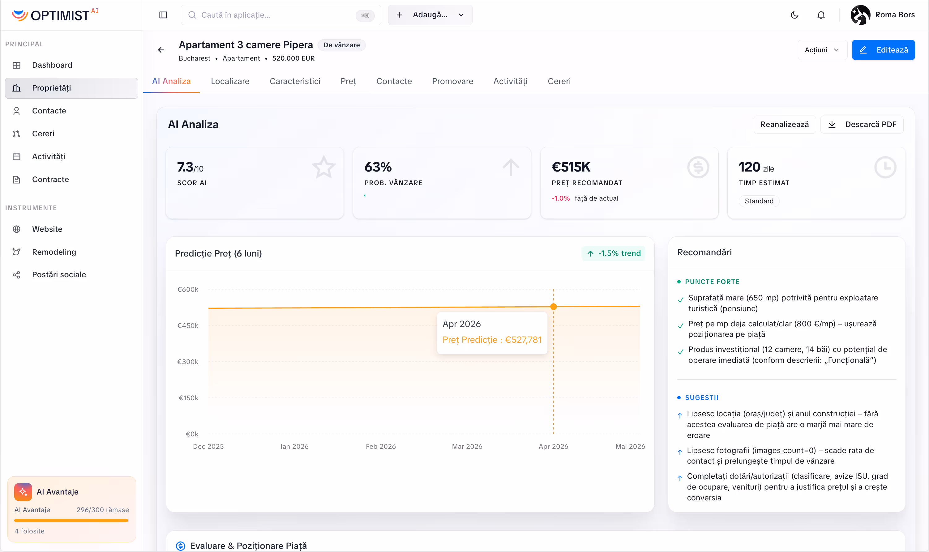 Spui ce vrei, iar Optimist construiește automat un website complet: pagini, proprietăți, imagini reale, formulare și hosting inclus.